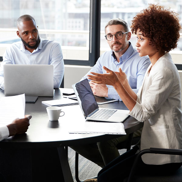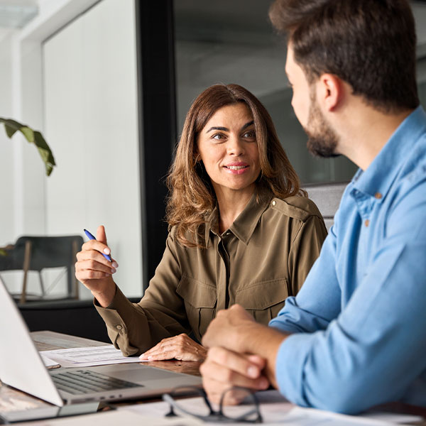 Two individuals sitting at a table, engaged in a discussion. One person is holding a tablet or document. Both individuals' faces are blurred out. The background appears to be an office setting with large windows and natural light.